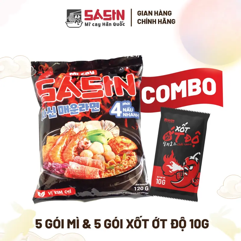 Combo 5 gói mì Sasin vị kim chi + 5 gói sốt ớt độ Sasin 10g